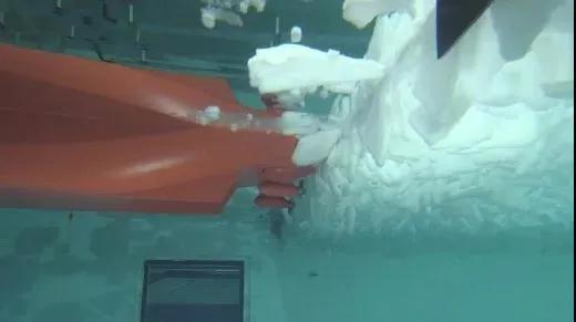 通過先后兩次的冰模試驗(yàn),全面測試了在北極航行船只的破冰工況,包含中厚陳年冰航道開辟試驗(yàn)、航道突破試驗(yàn)、流冰試驗(yàn)和冰脊穿越試驗(yàn)。
