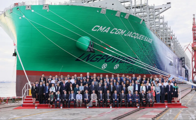 9月22日,由中國船舶集團(tuán)有限公司旗下滬東中華造船(集團(tuán))有限公司和中國船舶工業(yè)貿(mào)易有限公司作為聯(lián)合賣方為世界著名航運公司——法國達(dá)飛海運集團(tuán)建造的全球首艘23000TEU雙燃料動力集裝箱船“達(dá)飛雅克?薩德”號,在上海長興島造船基地命名交付。中國船舶集團(tuán)副總經(jīng)理孫偉、達(dá)飛海運集團(tuán)董事會主席魯?shù)婪颉に_德出席儀式并致辭,教母譚雅·薩德為新船命名,法國駐滬總領(lǐng)事紀(jì)博偉應(yīng)邀出席儀式。