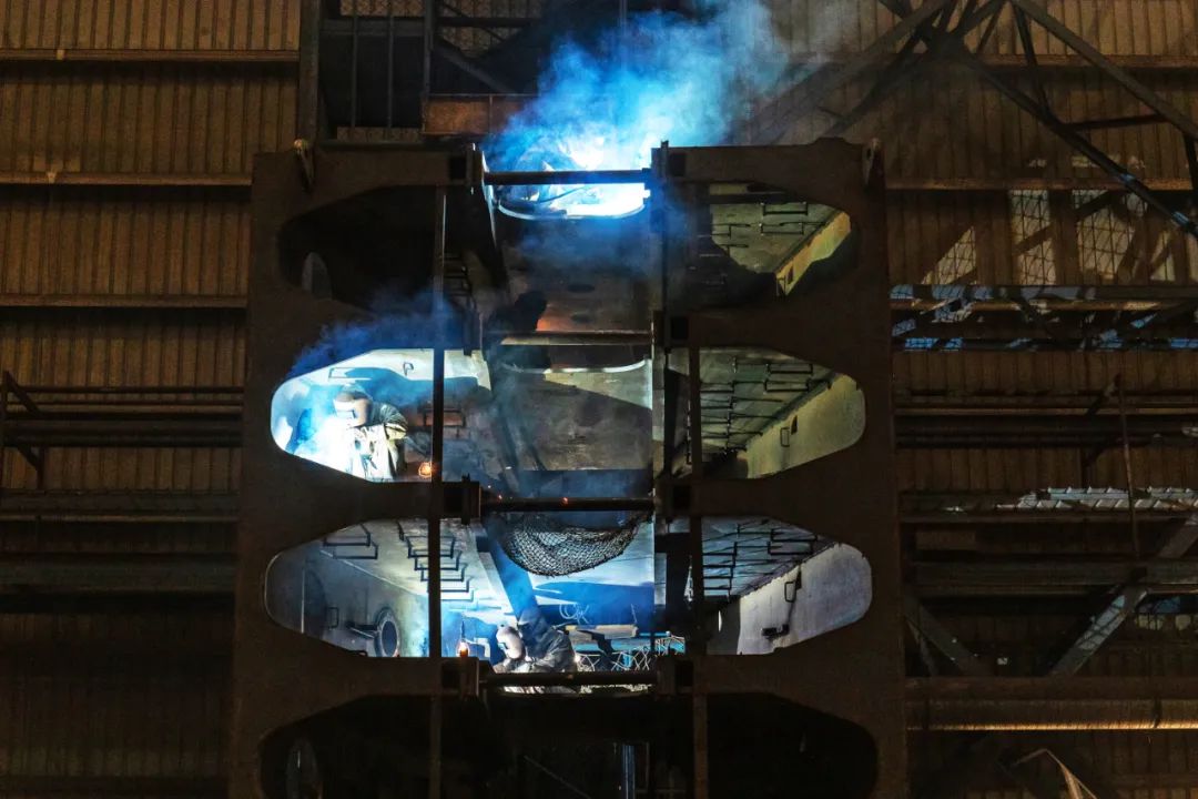 大船集團全體干部職工統(tǒng)一思想,凝心聚力,堅守本職擔當,積極主動作為,爭分奪秒,奮力沖刺。其中FPSO-8項目是大船集團建造的第七艘FPSO。今年以來,F(xiàn)PSO-8項目提前計劃節(jié)點,順利實現(xiàn)鋪底,并完成了連續(xù)六個總段的塢內(nèi)合攏。