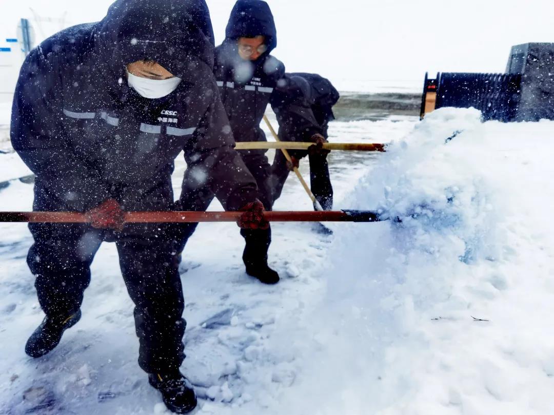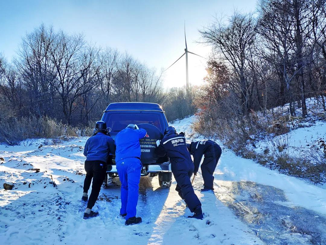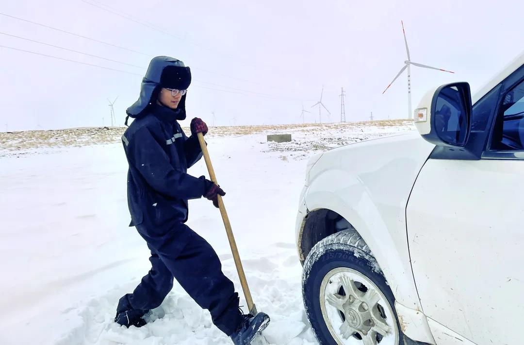 進入11月,內(nèi)蒙古自治區(qū)錫林郭勒盟地區(qū)迎來大面積的暴風雪,烏達萊項目人員在趕往風場的路上遭遇積雪路段,雖然氣候嚴寒,但為了及時消除機組故障,大家在積雪路段采取挖雪推車的方式齊心協(xié)力,一同開展清理路面積雪的行動。這個冬日,冰雪阻擋不住海裝追風者們勇往直前的步伐,他們只為恪盡職守完成一個承諾——風機旋轉(zhuǎn)、帶來光熱。