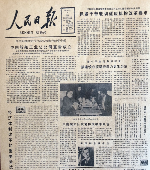 “改革開放是決定當代中國命運的關鍵一招?!?982年5月7日《人民日報》頭版刊載文章:“用經(jīng)濟組織替代行政機構進行經(jīng)營管理——中國船舶工業(yè)總公司宣布成立”,標題下文又著重強調(diào)“以提高經(jīng)濟效益,加速我國船舶工業(yè)為目標,實行工業(yè)與貿(mào)易,軍用品與民用品,造船與修船,科研與生產(chǎn)相結合的方針”。頭版還發(fā)表了以“經(jīng)濟體制改革的重要嘗試”為標題的“社論”。在這期《人民日報》的頭版還刊發(fā)了鄧小平同志接待外賓時的講話“搞建設,必須堅持自力更生為主”。