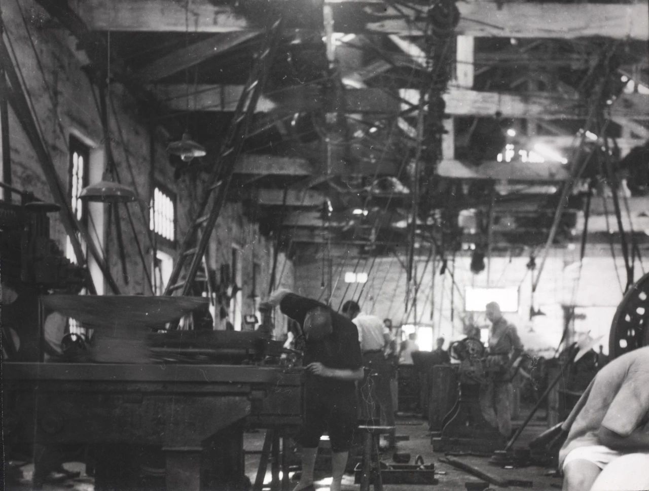 1934年武漢,上世紀30年代,武昌造船成立之初,工人們以手工作業(yè)“敲敲打打”形式開展修造船業(yè)務。修造的船只大多為100~300噸、鋼肋骨與木殼結構,僅有少量是鋼鉚接船體。建造的船只只能在長江上航行跑跑運輸。為了生存和救國,船廠還建造一些農用機械器具、槍支,以輔助民生、支援抗日。