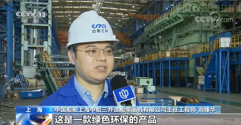????中國船舶上海中船三井造船柴油機有限公司主任工程師 劉鋒華:尺寸最大,達到了5層樓那么高,功率達到了63800多千瓦,功率也是最大的。這是一款綠色環(huán)保的產(chǎn)品,使用燃氣運行時氮氧化物的排放不到常規(guī)發(fā)動機的十分之一,硫氧化物和顆粒物的排放也是非常好的,不用裝任何后處理設備,都可以滿足IMO(國際海事組織)最新的排放法規(guī)要求。