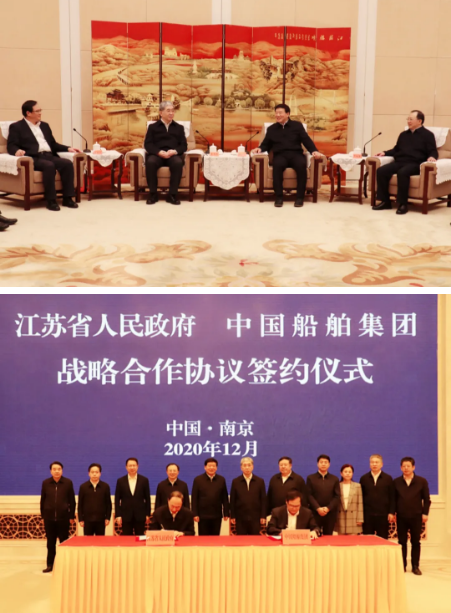12月21日,中國船舶集團有限公司與江蘇省人民政府在南京簽署戰(zhàn)略合作協(xié)議。中國船舶集團黨組書記、董事長雷凡培,黨組副書記、總經(jīng)理楊金成,黨組成員、副總經(jīng)理錢建平、杜剛,江蘇省委書記、省人大常委會主任婁勤儉,省委副書記、省長吳政隆,省委常委、省委秘書長郭元強,副省長馬秋林,省政府秘書長陳建剛等領(lǐng)導出席簽約儀式。楊金成、馬秋林分別代表雙方在協(xié)議上簽字。簽約前,雙方圍繞共同服務國家戰(zhàn)略,就進一步加強交流合作、實現(xiàn)共同發(fā)展進行深入交流并達成共識。