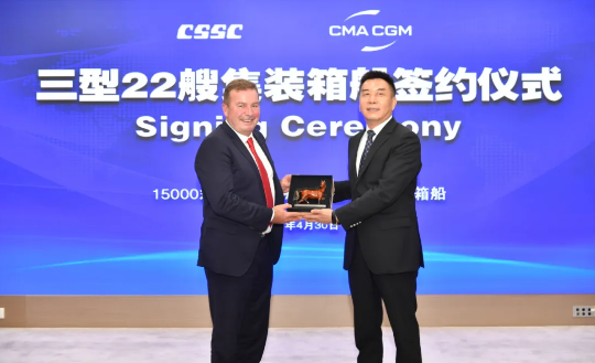 4月30日,中國船舶集團(tuán)旗下中船貿(mào)易攜手江南造船、滬東中華、北船重工聯(lián)合承接法國達(dá)飛海運集團(tuán)3型22艘集裝箱船訂單,中國船舶集團(tuán)黨組成員、副總經(jīng)理孫偉,達(dá)飛集團(tuán)執(zhí)行副總裁澤維爾出席簽約儀式。