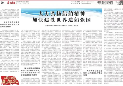 11月23日,中共中央黨校主辦的以思想理論宣傳為主旨的中央級大報(bào)《學(xué)習(xí)時(shí)報(bào)》刊發(fā)了中國船舶集團(tuán)有限公司黨組副書記、總經(jīng)理?xiàng)罱鸪墒鹈恼隆洞罅霌P(yáng)船舶精神 加快建設(shè)世界造船強(qiáng)國》。