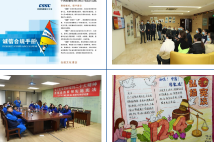 風(fēng)帆公司、綜合院等單位發(fā)布合規(guī)手冊,組織簽署合規(guī)承諾和合規(guī)考試;中船澄西、投資公司、七一一所、七二六所等單位精心制作并設(shè)置憲法宣傳展板;江南造船、中船九院等單位開展憲法法律知識問答,實現(xiàn)以考促學(xué);廣州公司持續(xù)開展“送法進校園”憲法宣傳活動,將法治學(xué)習(xí)延伸到所屬技校、幼兒園;七一〇所、七一五所等單位開展法律咨詢志愿服務(wù)活動,對外樹立良好的“法治形象”;駐香港企業(yè)中船資本、中船租賃大力宣傳憲法及香港基本法、香港國安法,提升員工憲法法治意識。