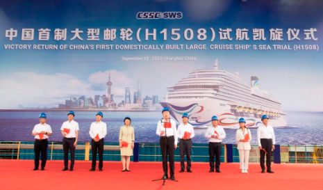 現(xiàn)場舉行了簡短的歡迎儀式。溫剛宣布中國首制大型郵輪完工試航所有驗證項目全部達標,試航任務(wù)圓滿完成。