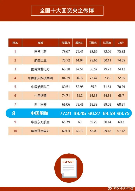 1月31日,由微博出品,人民網(wǎng)輿情數(shù)據(jù)中心、人民網(wǎng)數(shù)據(jù)研究院提供學(xué)術(shù)支持的“2023年度政務(wù)微博影響力報告”發(fā)布。“中國船舶”微博登上“全國十大國資央企微博”榜單,這是“中國船舶”微博第三次進(jìn)入“全國十大國資央企微博”排行榜。