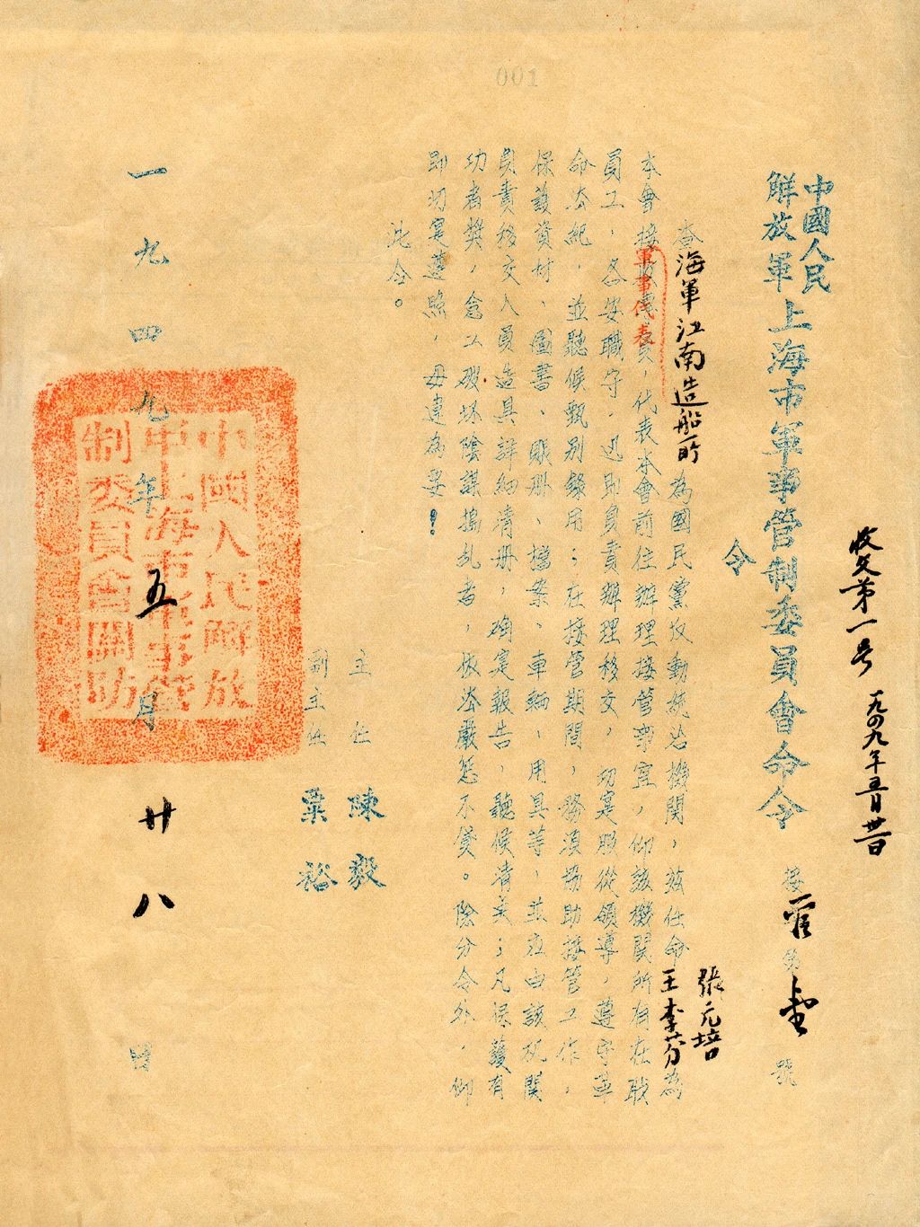 1949年5月上海,1949年5月28日,中國人民解放軍上海市軍事管制委員會(huì)發(fā)布第一號(hào)“軍管令”,即接管海軍江南造船所。
