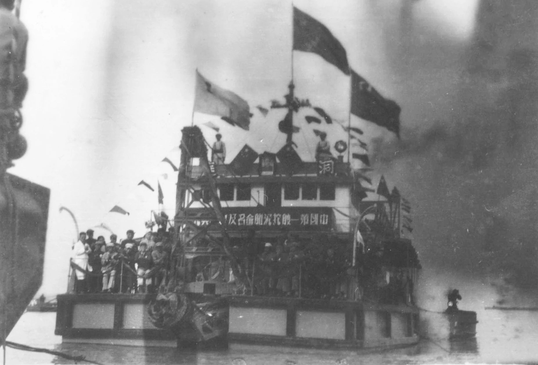 1949年7月上海,1949年7月23日,江南造船所舉行“職工慶功大會(huì)”。上海市市長兼軍管會(huì)主任陳毅、副市長曾山、華東海軍司令員張愛萍、上海市總工會(huì)主席劉長勝等出席了大會(huì)。會(huì)上總結(jié)修復(fù)廠房設(shè)備的經(jīng)驗(yàn),宣布恢復(fù)生產(chǎn)表彰有功人員。全所有 134人被評為一、二、三等功臣受到表彰。