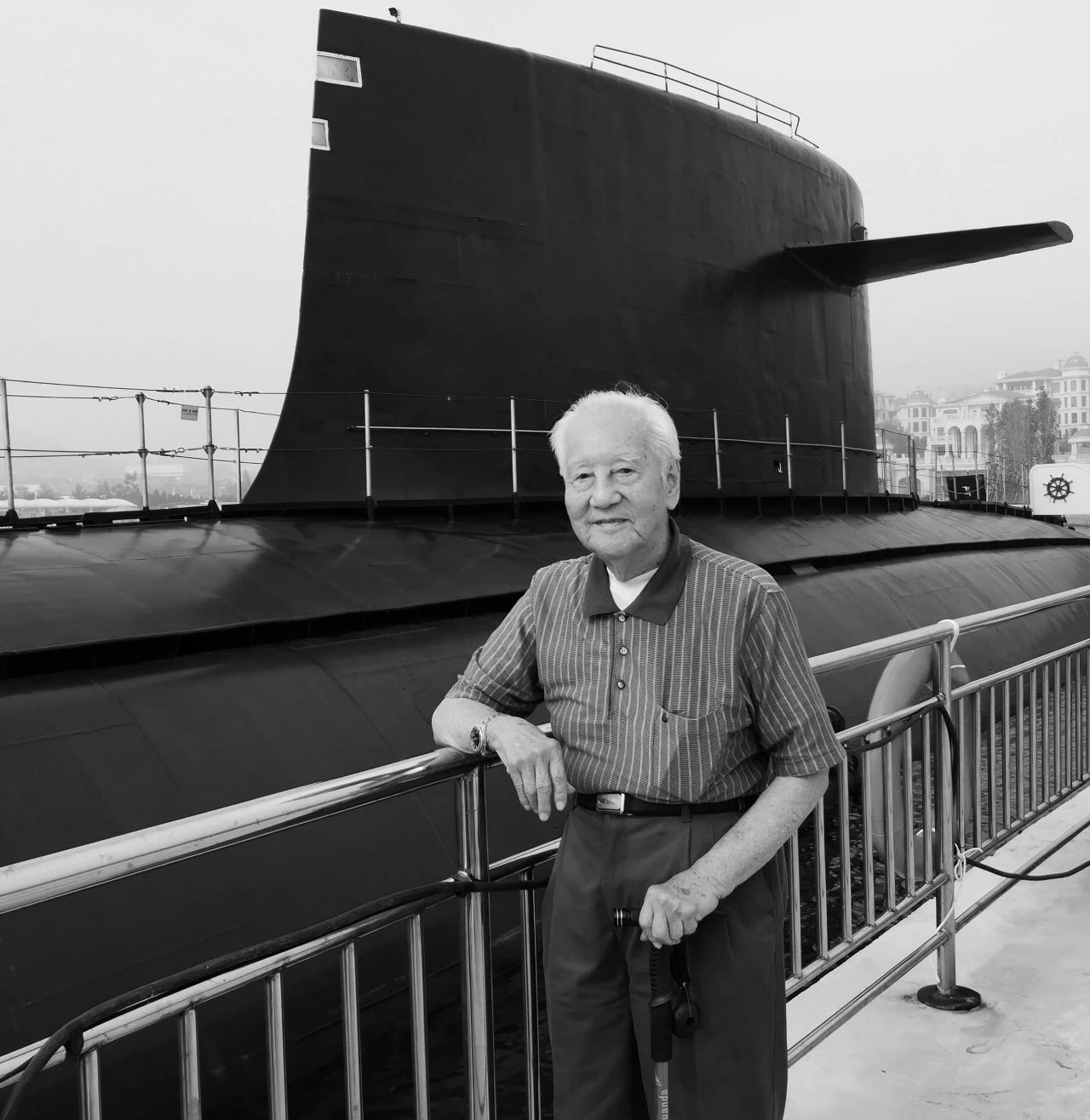 2018年,92歲高齡的黃旭華來到位于青島的海軍博物館。他們一行人如正常游客一樣買門票進去參觀,卻在檢票口被該館官兵認出。海軍博物館館長聞訊趕來,眾人感到黃旭華年事已高,建議其不要再下到401核潛艇,就在碼頭上向他匯報該艇入館以來的情況。但黃旭華夢牽子嗣,執(zhí)意下艇參觀。年已92高壽的黃旭華,在核潛艇這樣狹小的空間活動,尤其是進出直徑不足1米的水密門,難度可想而知。進艇之后,黃旭華駐足凝視著艇內(nèi)的每一個部位、每一臺設備,進住艙、上戰(zhàn)位,用他的話說:“一點都不累!”并應邀在留言簿上揮毫題詞:“騎鯨蹈海日游八萬里五洋捉鱉?!边@正是黃旭華雖已過鮐背之年,仍壯懷激烈的心境寫照。