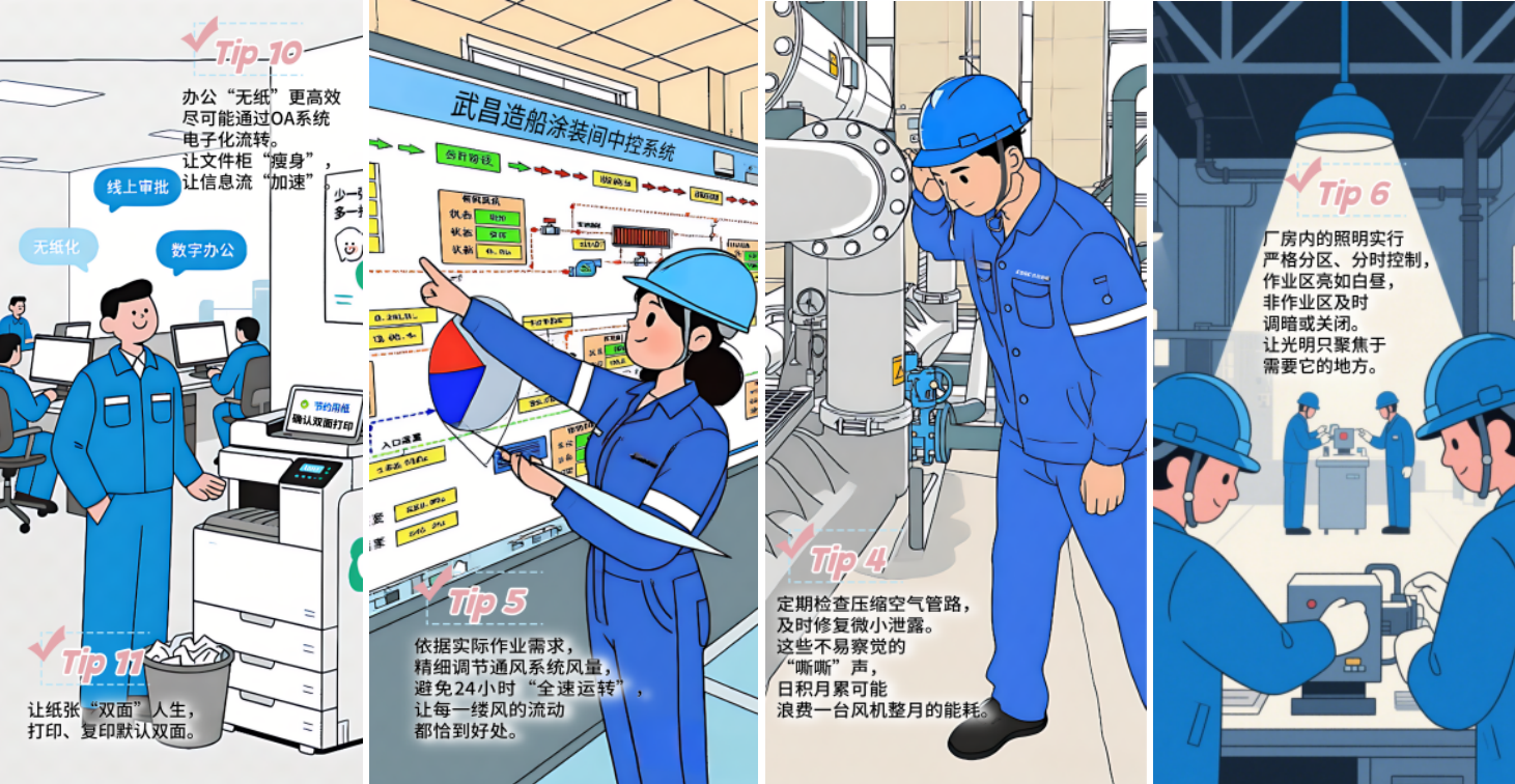 武昌造船在節(jié)能宣傳周期間組織開展了“船廠節(jié)能秘籍”征集活動,以船廠員工的一天為軸線,收集到各類節(jié)能基本操作,形成了《這些基本操作,我知道你一定能做到》宣傳材料,并通過公司公眾號發(fā)布,向員工普及節(jié)能知識與技巧,擴大節(jié)能宣傳覆蓋面。同時開展 “停用空調(diào)”能源緊缺體驗行動,倡議全體員工在全國低碳日,關(guān)閉辦公室、會議室及非必要區(qū)域空調(diào)設(shè)備,通過實際行動感受能源緊缺,踐行節(jié)能理念,進一步增強員工資源憂患意識。