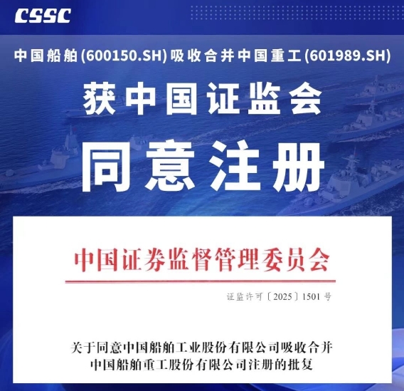 7月18日,中國證監(jiān)會發(fā)布《關于同意中國船舶工業(yè)股份有限公司吸收合并中國船舶重工股份有限公司注冊的批復》,同意中國船舶工業(yè)股份有限公司換股吸收合并中國船舶重工股份有限公司。