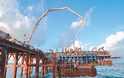 7月6日,隨著主橋23號(hào)墩承臺(tái)最后一車混凝土的澆筑,中國(guó)援馬爾代夫中馬友誼大橋5個(gè)主橋承臺(tái)全部施工完成,標(biāo)志著占全橋施工總量約70%的主橋部分從此徹底擺脫印度洋的強(qiáng)涌浪襲擾,進(jìn)入上部結(jié)構(gòu)施工階段。