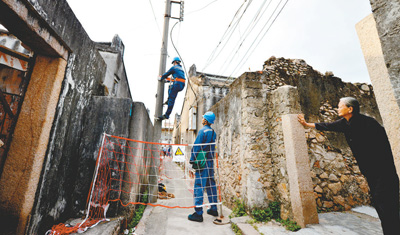 南方電網(wǎng)廣東汕頭金平供電局運維人員對當(dāng)?shù)匾惶幣f線路進行改造。(潘軍 攝)