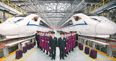 12月4日,西成高鐵首發(fā)乘務(wù)班組在中國鐵路成都局集團(tuán)有限公司成都動(dòng)車段亮相。(薛玉斌 攝)