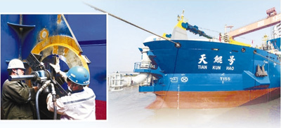 “船上鋼樁臺車安裝了4個大油缸,單個就達(dá)38噸,所有安裝誤差都只有0.2毫米”,安裝輪機(jī)車間主任沙勝紅說,“考驗還在繼續(xù)”。輪機(jī)車間的工人全部是訓(xùn)練有素的技術(shù)員工,他們克服了難以想象的困難,硬是拿下全船高難度的設(shè)備安裝工作,質(zhì)量贏得船東、船檢的一致好評。