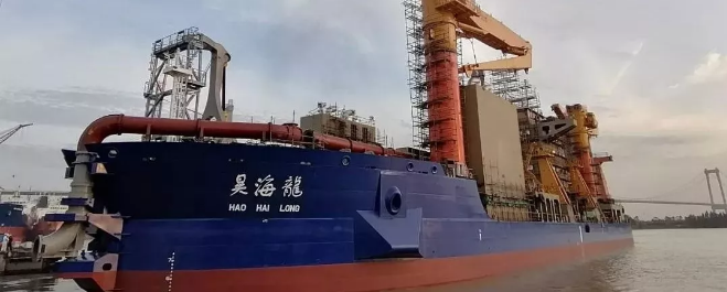 10月31日,黃埔文沖分別為美國Del Monte公司建造的600FEU全冷箱集裝箱船1號船和佛山市盈昊泰貿(mào)易有限公司建造的7800千瓦自航絞吸式挖泥船順利出塢。7800千瓦自航絞吸式挖泥船總長148米,最大挖深38米,配置了挖巖、挖黏土和挖沙等3種不同類型的絞刀,適用于挖掘淤泥、黏土、密實砂質(zhì)土、礫石、強風化巖以及抗壓強度在50兆帕以內(nèi)的中弱風化巖; 配備雙槳、雙轉(zhuǎn)動導(dǎo)流管、全電力驅(qū)動裝置,總裝機功率達25260千瓦,為亞洲最大功率自航絞吸式挖泥船,是我國新一代沿海水域、港口、航道疏浚、吹填的“神兵利器”。