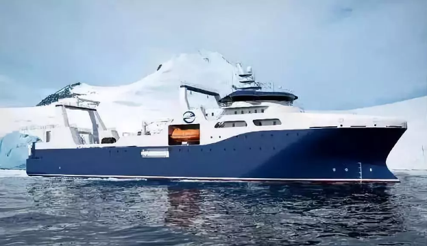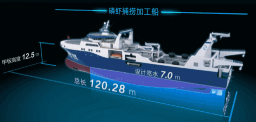 ????“深藍(lán)號”由黃埔文沖建造,七〇八所參與設(shè)計,總長約120米,型寬21.6米,設(shè)計吃水7.3米,設(shè)計航速15節(jié),主機功率8000 千瓦,載重噸約5000噸?!吧钏{(lán)號”是我國自主研制建造的第一艘漁業(yè)捕撈加工一體船,也是目前最大最先進的漁業(yè)捕撈加工一體船,取得近200項知識產(chǎn)權(quán)保護,實現(xiàn)了我國現(xiàn)代化漁業(yè)船舶裝備領(lǐng)域的重大突破,達(dá)到世界先進水平;主要用于南大洋漁業(yè)捕撈,兼顧海洋科考功能,可滿足ICE-A冰區(qū)(冰厚度0.8米)及-25℃低溫環(huán)境的營運要求。