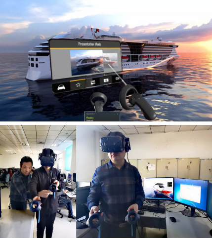 ????該平臺通過總體總師與三維造型師的協(xié)同交互,完成全船三維設(shè)計(全船造型和艙室內(nèi)部裝飾等)并搭建逼真場景,用戶通過穿戴智能頭顯,操縱控制手柄,真正實(shí)現(xiàn)了“漫步甲板、穿行船艙”的自主漫游體驗。