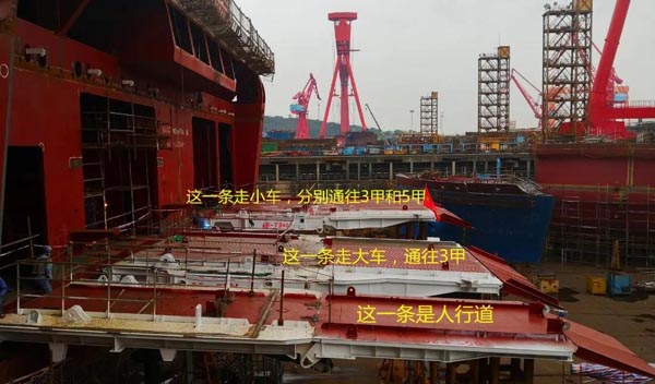 其次,大車停在3甲車庫,小車停在5甲車庫,可使船舶的重心會(huì)更低、整體更穩(wěn),最重要的是還考慮到港口條件進(jìn)行了量身定做。