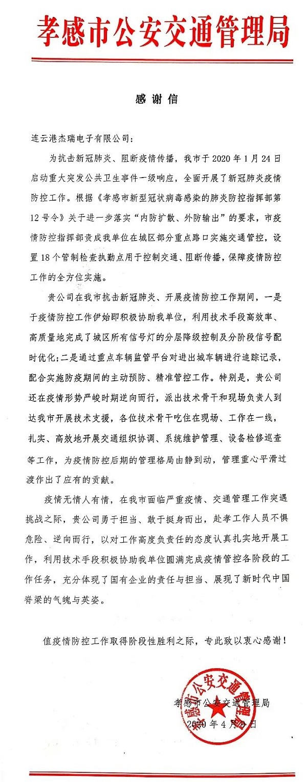????中國船舶集團七一六所下屬杰瑞電子公司收到湖北省孝感市公安交通管理局發(fā)來的感謝信,對杰瑞電子赴孝感工作人員不懼危險、逆向而行,以高度負責任的態(tài)度,利用技術手段,積極協(xié)助疫情防控工作表示感謝。
