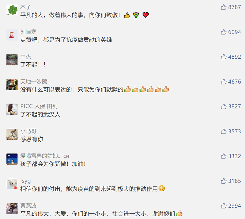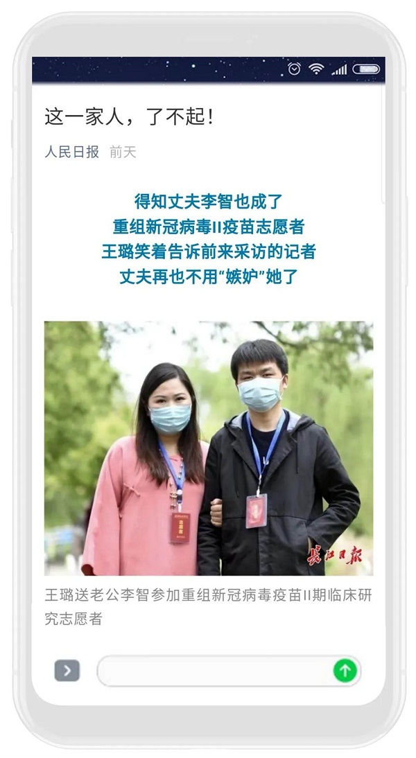 ????4月18日,人民日報微信公眾號推送了這樣一條消息,詳細介紹了一位土生土長的武漢人王璐及其家人自愿報名接種新冠疫苗的事跡,消息收獲了10萬+的閱讀量與3.2萬的“在看” ,還有動輒幾千的留言點贊!這位女主角王璐來自中國船舶集團七一七所,不同于第一批結束醫(yī)學觀察的志愿者,王璐所在組的年齡在20歲到50歲,是最早一批高劑量的接種者。