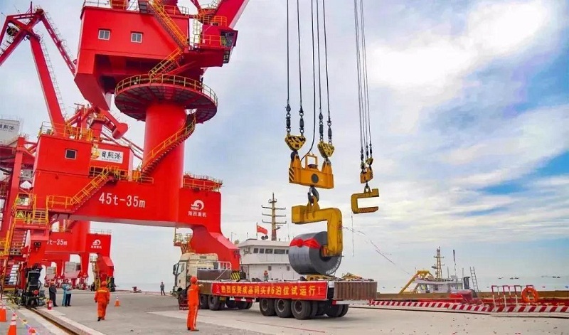 ????該門機(jī)主要用于成品鋼板、卷裝船及煤炭、廢鋼等裝卸船作業(yè)。門機(jī)配備有平衡掛梁、廢鋼吸盤、C字鉤、板杯夾鉗、散貨抓斗、六瓣廢鋼抓斗6種吊具,能滿足從鋼廠原材料海上進(jìn)貨卸船,到成品(鋼卷、鋼板)裝船海運(yùn)等整個(gè)過程的裝卸需求,改變了鋼廠以往只能依靠陸地貨運(yùn)進(jìn)行成品運(yùn)輸?shù)臓顩r,極大地提高運(yùn)輸效率。