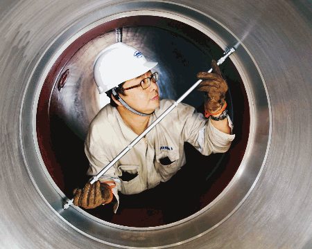 上海船院質量檢測工程師正在檢測扭曲舵套筒。該扭曲舵由上海船院研發(fā)設計,將用于黃埔文沖在建的2700TEU集裝箱船。