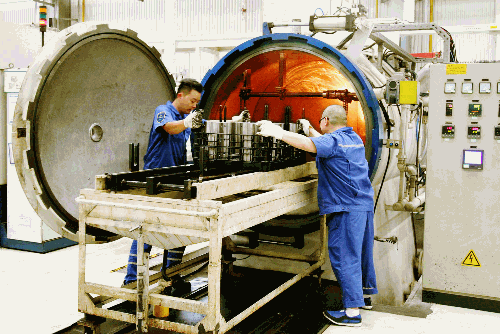 淬火的爐旁,氣溫高達50°C。重慶紅江操作師傅嫻熟地將工件從爐內拉出,吊裝到指定工位進入下道工序,再裝上另一批產(chǎn)品入爐,繼續(xù)進行熱處理。