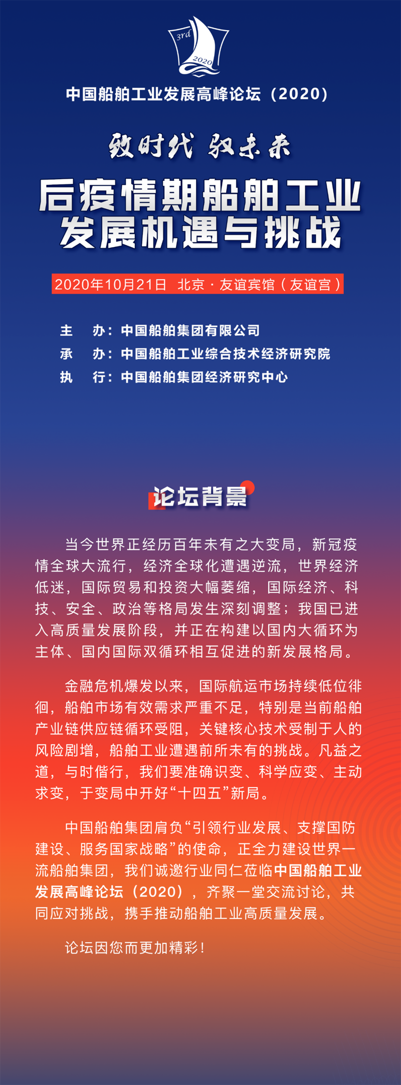 中國(guó)船舶集團(tuán)肩負(fù)“引領(lǐng)行業(yè)發(fā)展、支撐國(guó)防建設(shè)、服務(wù)國(guó)家戰(zhàn)略”的使命,正全力建設(shè)世界一流船舶集團(tuán),我們誠(chéng)邀行業(yè)同仁蒞臨中國(guó)船舶工業(yè)發(fā)展高峰論壇(2020),齊聚一堂交流討論,共同應(yīng)對(duì)挑戰(zhàn),攜手推動(dòng)船舶工業(yè)高質(zhì)量發(fā)展。