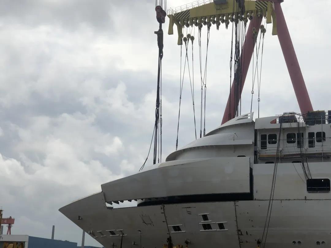 國產(chǎn)首制大型郵輪完成首個艏部總段吊裝! 預(yù)計9月實現(xiàn)全船結(jié)構(gòu)貫通。