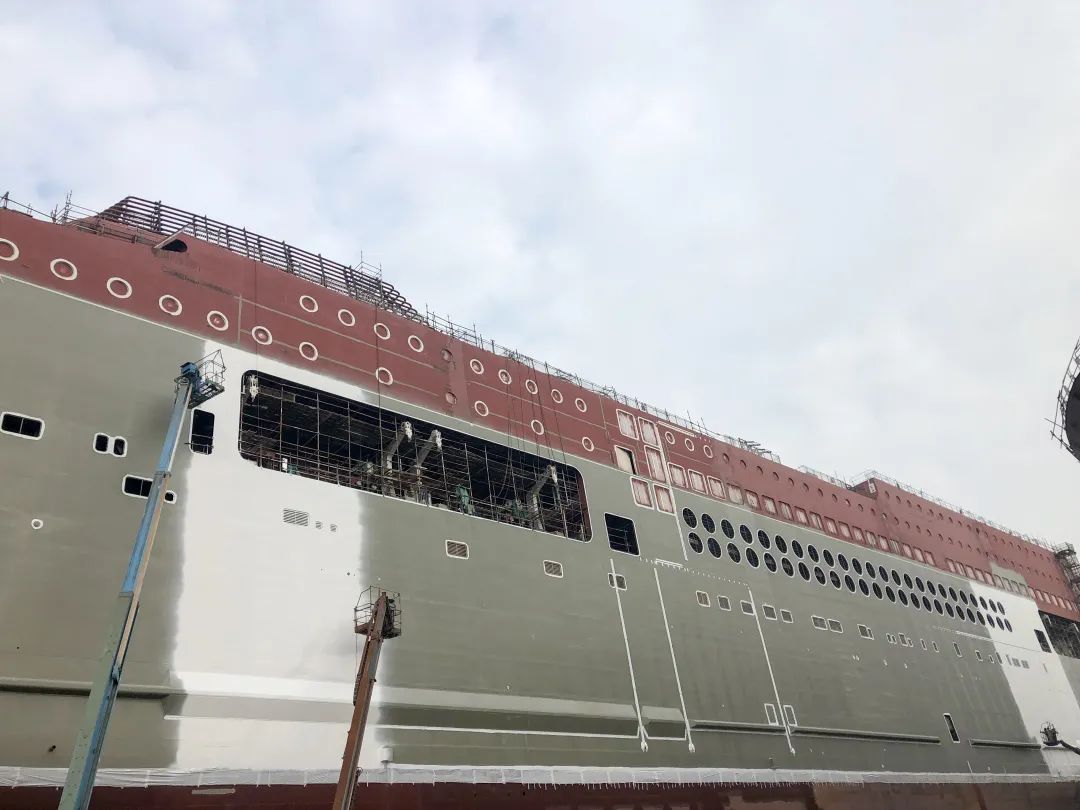 該船實現(xiàn)了出塢前上建亮燈。電纜拉放完成率87.8%,作為全球最大的豪華客滾船,該船全船電纜長度達到了946公里(相當于從廣州到重慶);出塢前已完成了830公里電纜的拉放工作。涂裝完整性實現(xiàn)突破,該船出塢時上層建筑上方仍有部分區(qū)域未完成涂裝? 這是因為該船垂直高度已接近40米,超過了船塢高空車的最大極限。