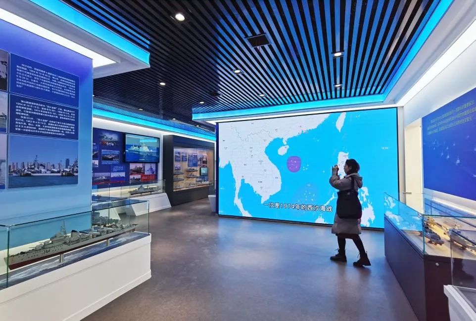 現(xiàn)代海軍裝備主題展館分室內(nèi)、室外兩個(gè)展區(qū),設(shè)立六個(gè)篇章,重點(diǎn)展示了人民海軍成立以來(lái)艦船裝備從沿岸近海到走向深遠(yuǎn)海的代表成果。除圖文影視、模型外,展覽還引入了航母艦載機(jī)起降虛擬體驗(yàn)、海盜射擊游戲、艦載機(jī)起飛指揮等多個(gè)體驗(yàn)互動(dòng)類項(xiàng)目。