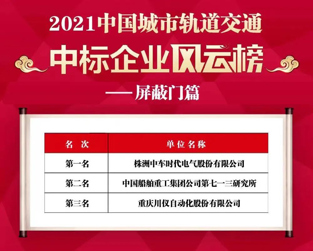 3月20日,中國(guó)船舶第七一三研究所成功中標(biāo)成都軌道交通27號(hào)線一期工程站臺(tái)門(mén)系統(tǒng)集成及安裝項(xiàng)目。