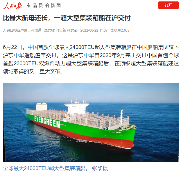 今天,中國首艘全球最大24000TEU超大型集裝箱船在中國船舶集團旗下滬東中華簽字交付,比最大航母還長,甲板面積相當于3.5個標準足球場,最大堆箱層數(shù)可達25層,相當于22樓的高度……
