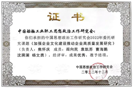 近日,由中國船舶工業(yè)職工思想政治工作研究會申報(bào)的中國思想政治工作研究會2022年委托課題《加強(qiáng)企業(yè)文化建設(shè),推動企業(yè)高質(zhì)量發(fā)展研究》評審結(jié)果公布,成果優(yōu)秀,報(bào)經(jīng)中央宣傳部領(lǐng)導(dǎo)審定準(zhǔn)予結(jié)項(xiàng)。這是中國船舶政研會首次承擔(dān)中國政研會委托課題并獲評優(yōu)秀。
