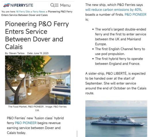 由于“P&O Pioneer”不必掉頭,每次航線將節(jié)省7分鐘的時間和近60%的燃料消耗,從而能在同樣的航行時間下降低航行速度、燃料消耗和排放?!癙&O Pioneer”的首航標志著英法航線進入了綠色低碳的新時代。