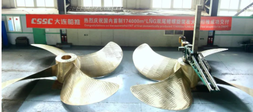 大連公司下屬大連船推成功交付自主開(kāi)發(fā)設(shè)計(jì)制造的17.4萬(wàn)立方米LNG運(yùn)輸船雙尾鰭螺旋槳。