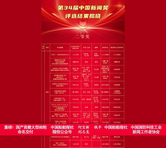 11月7日,中華全國新聞工作者協(xié)會主辦的第34屆中國新聞獎評選結果揭曉。中國國防科技工業(yè)新聞工作者協(xié)會推薦中國船舶報社特約記者何寶新、記者劉志良主創(chuàng)、錢平編輯的作品《重磅!國產首艘大型郵輪命名交付》獲消息類二等獎。