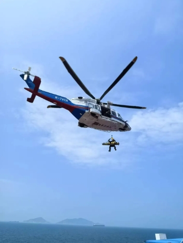 接報后,廣船國際立即啟動航空救援,第一時間聯(lián)系海上航空救助和最近的珠海醫(yī)院,一場生死競速在南海的碧海藍(lán)天間極速展開!在交通運(yùn)輸部南海第一救助飛行隊、珠海市中山大學(xué)附屬第五醫(yī)院和試航項目組的通力協(xié)作下,半小時后,藍(lán)白相間的救援直升機(jī)飛臨懸停試航船舶的直升機(jī)平臺。