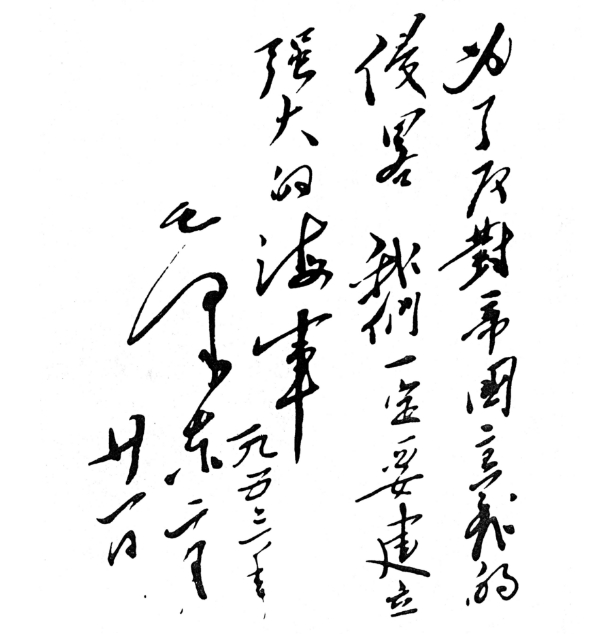 1953年2月19日,毛澤東在武漢登上長江艦視察長江中下游四省,并在長江艦上為海軍題詞:“為了反對帝國主義的侵略,我們一定要建立強大的海軍?!贝葱兄聊暇珴蓶|提出要在南京檢閱海軍戰(zhàn)艦。華東海軍立即抽調(diào)了“廣州”號和“南昌”號護衛(wèi)艦、“黃河”號登陸艦,以及101號、104號魚雷艇參加檢閱。幾天中,毛澤東連續(xù)5次都寫下同樣的題詞:“為了反對帝國主義的侵略,我們一定要建立強大的海軍”。這是中國領(lǐng)導(dǎo)人對建設(shè)強大海軍、建設(shè)一流裝備的殷切期望,是新生的中國對建設(shè)強大海防的決心。如今這顆刻著偉人囑托的銘石,靜靜矗立在江南造船長興島造船基地行政樓前的草坪,也靜靜地矗立在每一位江南人的心中。