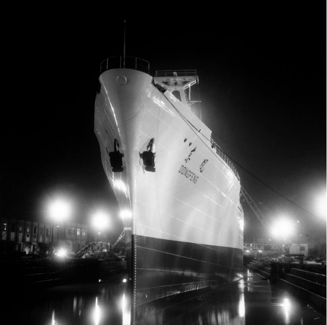 “一五”后期,研制萬噸級遠洋貨船被列為國家新科技規(guī)劃的重點項目。在西方長期封鎖尤其是后來蘇聯(lián)中止援助的困難局勢下,“東風(fēng)”號是中國人首次嘗試自行設(shè)計、自行建造,全部采用國產(chǎn)設(shè)備的首艘萬噸遠洋船。1960年4月15日,“東風(fēng)”號下水,時任上海市委書記陳丕顯、副市長曹荻秋等人出席下水典禮。萬噸輪被命名為“東風(fēng)”號。