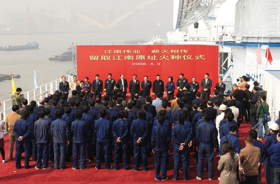 2008年4月,江南造船老廠建造的最后一艘船“遠望6”號航天測量船即將交付。4月3日,時任江南造船搭載部部長黃文飛作為取火者從“遠望6”號船前甲板的上建位置手拿焊槍取火引燃火炬。火炬依次傳遞至勞動模范、三八紅旗手、江南造船領(lǐng)導(dǎo)等,最后傳至?xí)r任中船集團總經(jīng)理陳小津手中并由他點燃了火種盒。6月3日,江南造船人親手建造的船舶特地趕回“娘家”,載著江南“火種”駛往新基地,為新建造的產(chǎn)品開工點火。