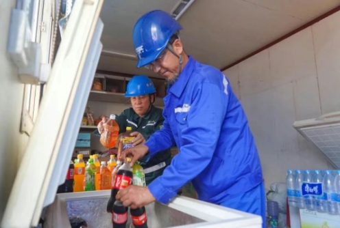 在飲食消暑保障上,大船天津構(gòu)建起全鏈條清涼補給體系。清涼解暑的綠豆湯成為員工餐桌上的“標配”,供隨餐飲用;4000余箱瓶裝水以及大批藿香正氣水作為夏季防暑降溫物資配送至各部門、各協(xié)作單位班組;作業(yè)現(xiàn)場的冰柜里,清涼飲品隨時待?。粸閰f(xié)作單位員工送上遮陽草帽,讓清涼關(guān)懷覆蓋每一位一線勞動者。
