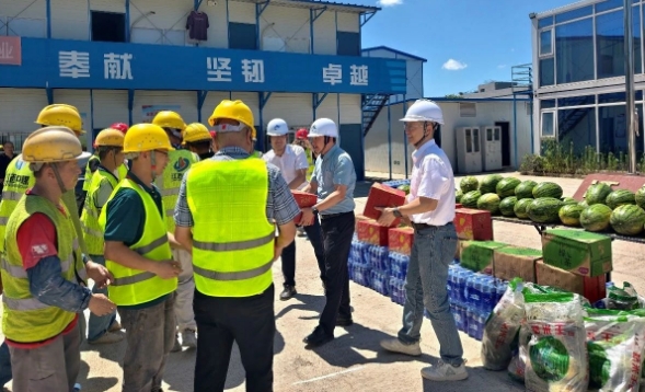 中船國際工程在項目現(xiàn)場開展綜合檢查工作,并向堅守崗位的項目員工及勞務(wù)隊伍送上防暑降溫物資,叮囑大家要科學(xué)合理安排作業(yè)時間,切實(shí)做好防暑降溫措施。
