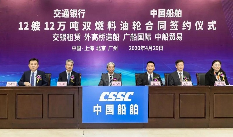 ????4月29日,中國船舶集團有限公司旗下中國船舶工業(yè)貿(mào)易有限公司、上海外高橋造船有限公司、廣船國際有限公司與交通銀行股份有限公司旗下交銀金融租賃有限責(zé)任公司在北京、上海、廣州三地以“云簽約”方式簽署12艘12萬噸雙燃料油船建造合同,合同總金額約46億元人民幣,這是中國船舶集團旗下單位近期承接的又一單筆大額訂單。中國船舶集團黨組書記、董事長雷凡培,交通銀行黨委書記、董事長任德奇,中國船舶集團黨組成員、副總經(jīng)理孫偉,交通銀行黨委委員、副行長呂家進(jìn)出席簽約儀式。