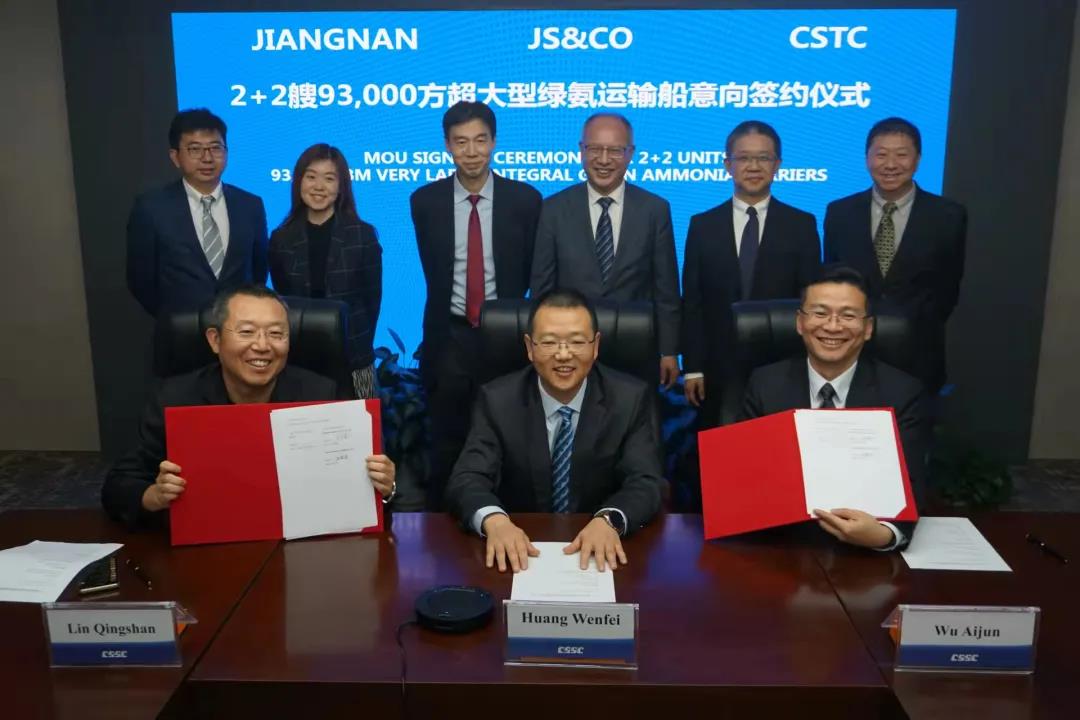 12月10日,中國(guó)船舶集團(tuán)旗下江南造船攜手貿(mào)易公司與JS & Co視頻簽署了2+2艘93000立方米超大型綠氨運(yùn)輸船(VLAC)合作備忘錄。