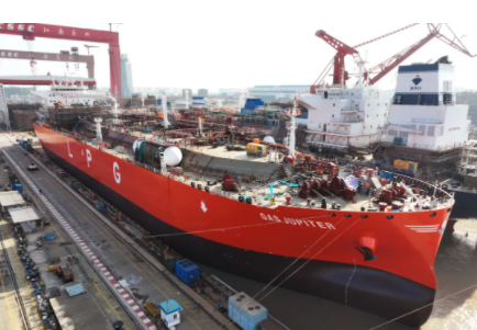 2月15日,在4號塢率先出塢的是江南造船為廣東九豐能源集團有限公司建造的國內首制79800立方米Mark III型薄膜式液化天然氣(LNG)運輸船,以及為天津西南海運有限公司建造的93000立方米超大型液化氣船(VLGC)首制船;同時起浮的還有93000立方米VLGC后續(xù)半船和即將移位至3號塢的24100TEU超大型集裝箱船的艏部巨型環(huán)段。同批次的后續(xù)作業(yè)將轉移到3號塢,預計在2月24日,江南造船為地中海航運(MSC)建造的24100TEU超大型集裝箱船系列第二艘(H2733船)以及為新加坡Petredec公司建造的93000立方米VLGC系列第二艘(H2736船)出塢,后續(xù)兩艘半船同步起浮。